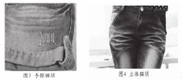 两者出现如此差异主要是因操作设备和工具的不同。前者称手擦猫须,主要是靠手工完成的,先把需手擦的部位放在刻有凸凹猫须形状的橡胶板上,然后手工用砂纸在牛仔裤表面进行摩擦,橡胶板凹进去的地方没有发生或只轻微与砂纸摩擦,基本保留牛仔织物的原色[4],而突出部分则直接发生摩擦作用,摩擦处表面的染色基层被破坏,形成了轻微的白色阴影效果。立体猫须是牛仔裤经水洗后,用高温机压出所需花纹,再喷胶定形,经焗炉烘干后完成的,所以产生的猫须形状更立体,且稳定性强,不易变形。